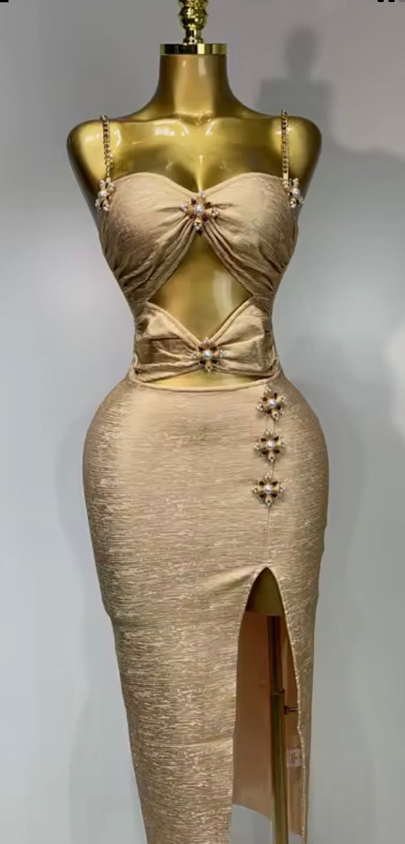 This is a glamorous, gold bandage midi-dress with a luxurious sheen and significant embellishment.