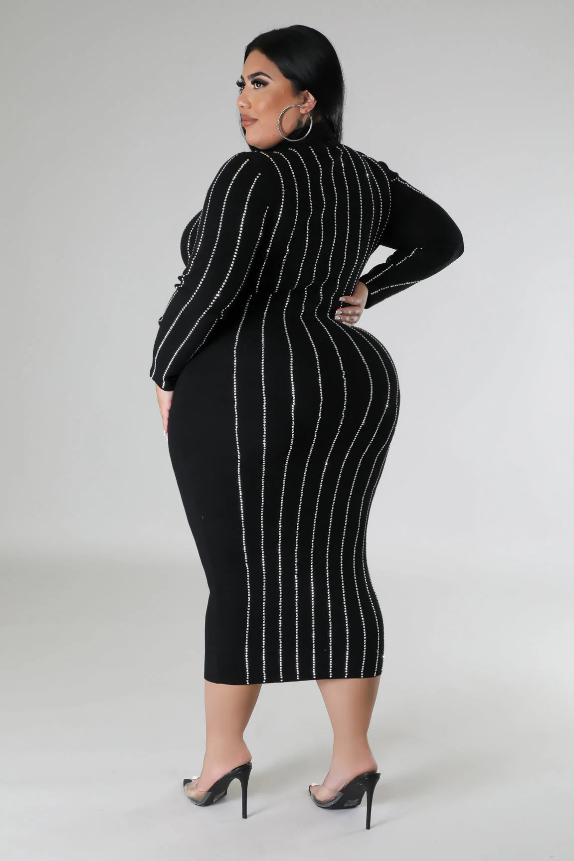 It's a form-fitting, long-sleeved black sweater dress with a mock turtleneck neckline. Its most defining feature is the vertical rows of shimmering silver rhinestones that run down the entire length of the dress, creating a glamorous, elongating stripe effect.