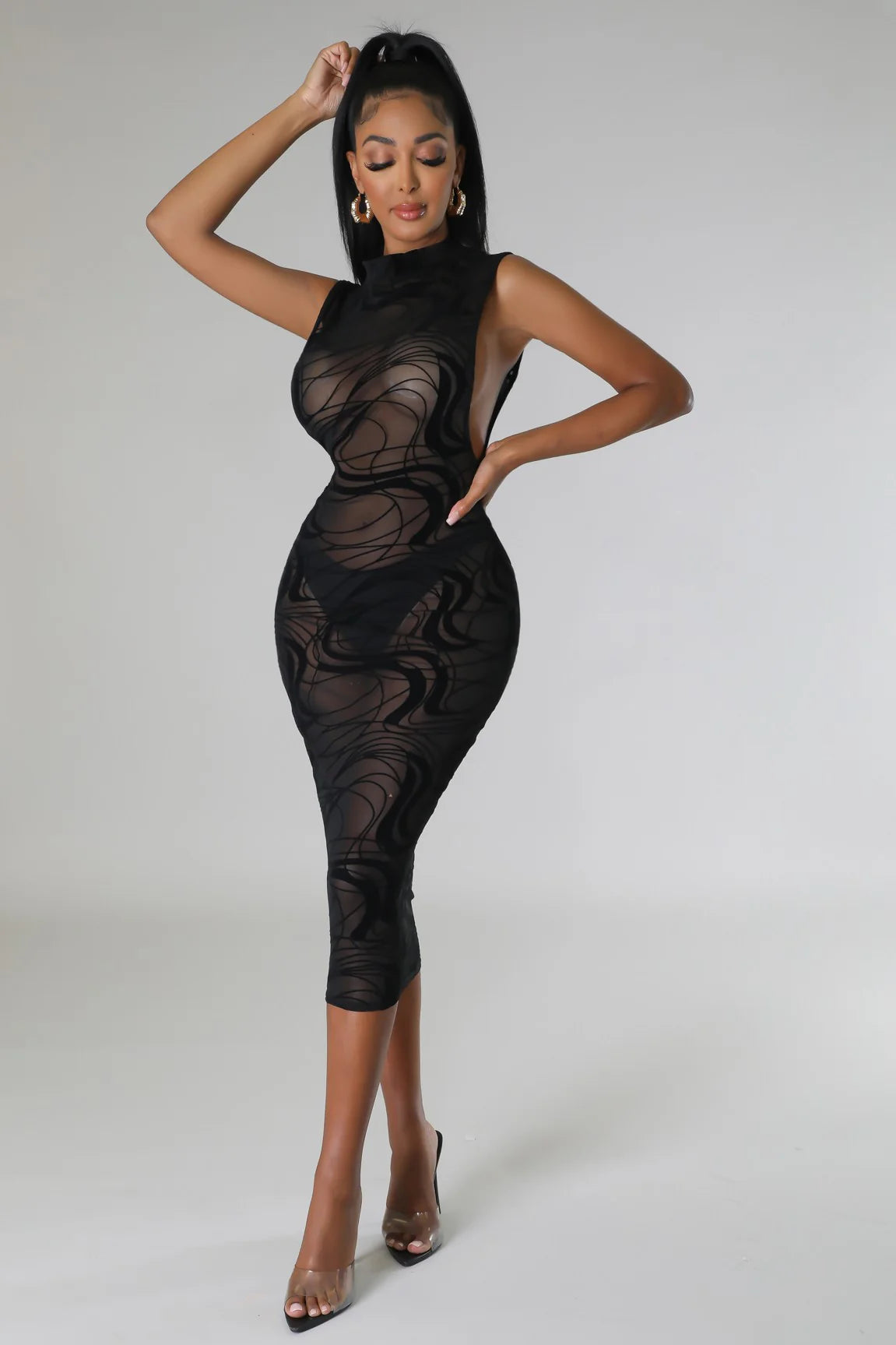 These midi-length bodycon dresses feature a captivating, all-over swirl and wave graphic print that mimics the look of topographic maps or abstract linework.