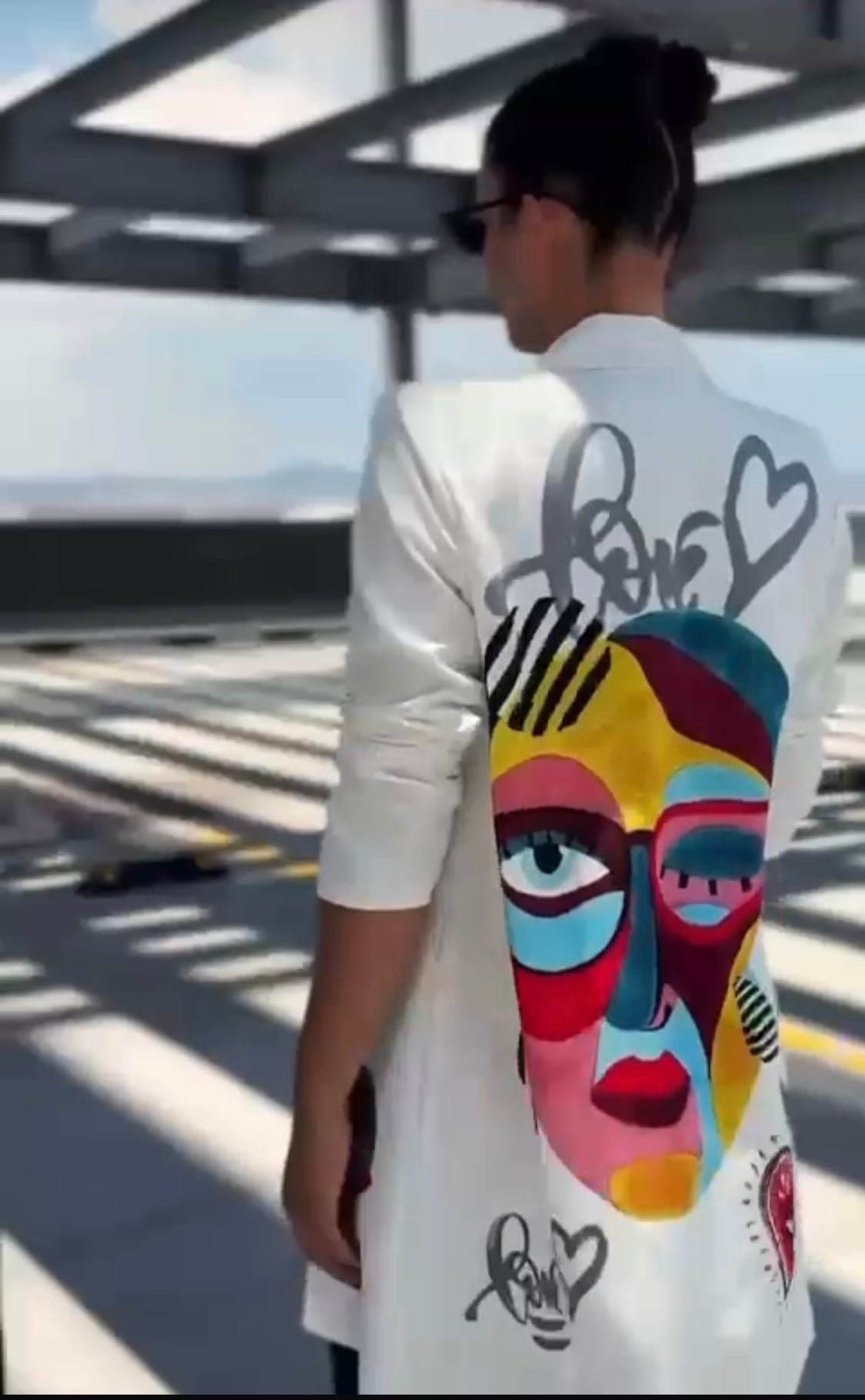 This appears to be a white, long-line blazer or coat that has been custom-painted or hand-embellished with vibrant, abstract, and folk-art inspired designs.