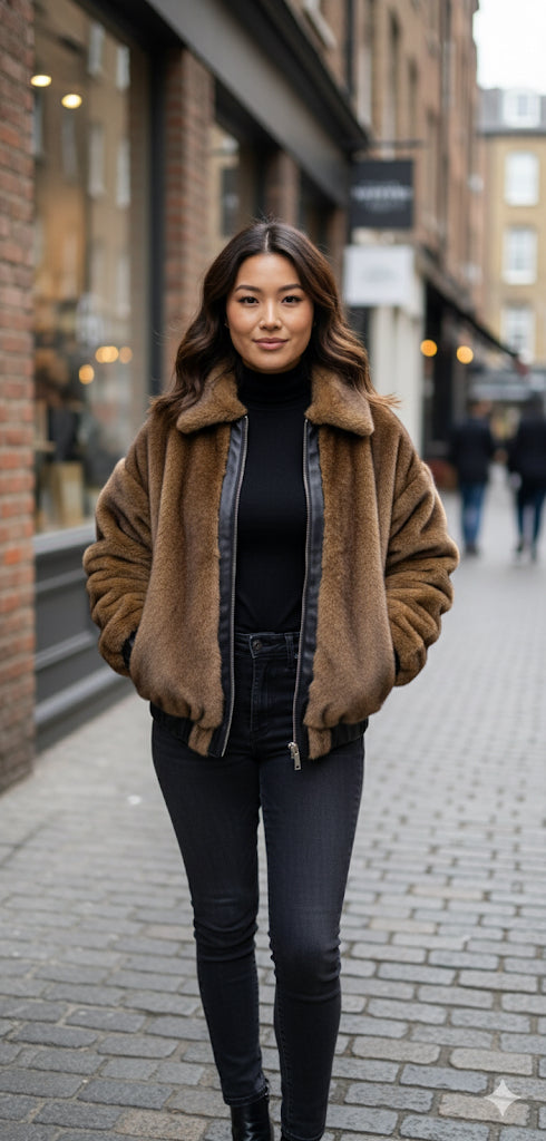 The jacket is a sporty, athleisure-style pullover with a half-zip closure at the neckline