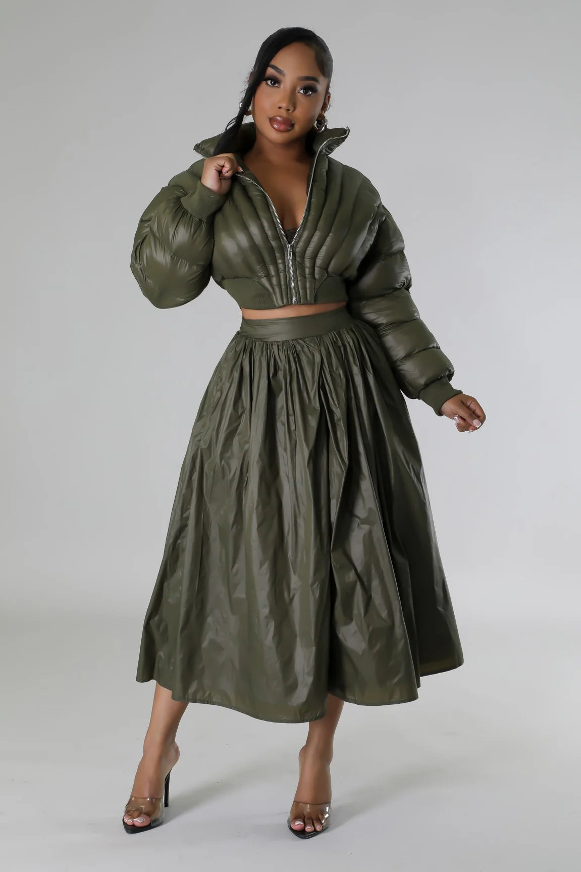 This skirt set features a cropped, padded, olive green puffer jacket and a matching olive green midi-length A-line skirt, creating a chic and coordinated look. Vegan leather
