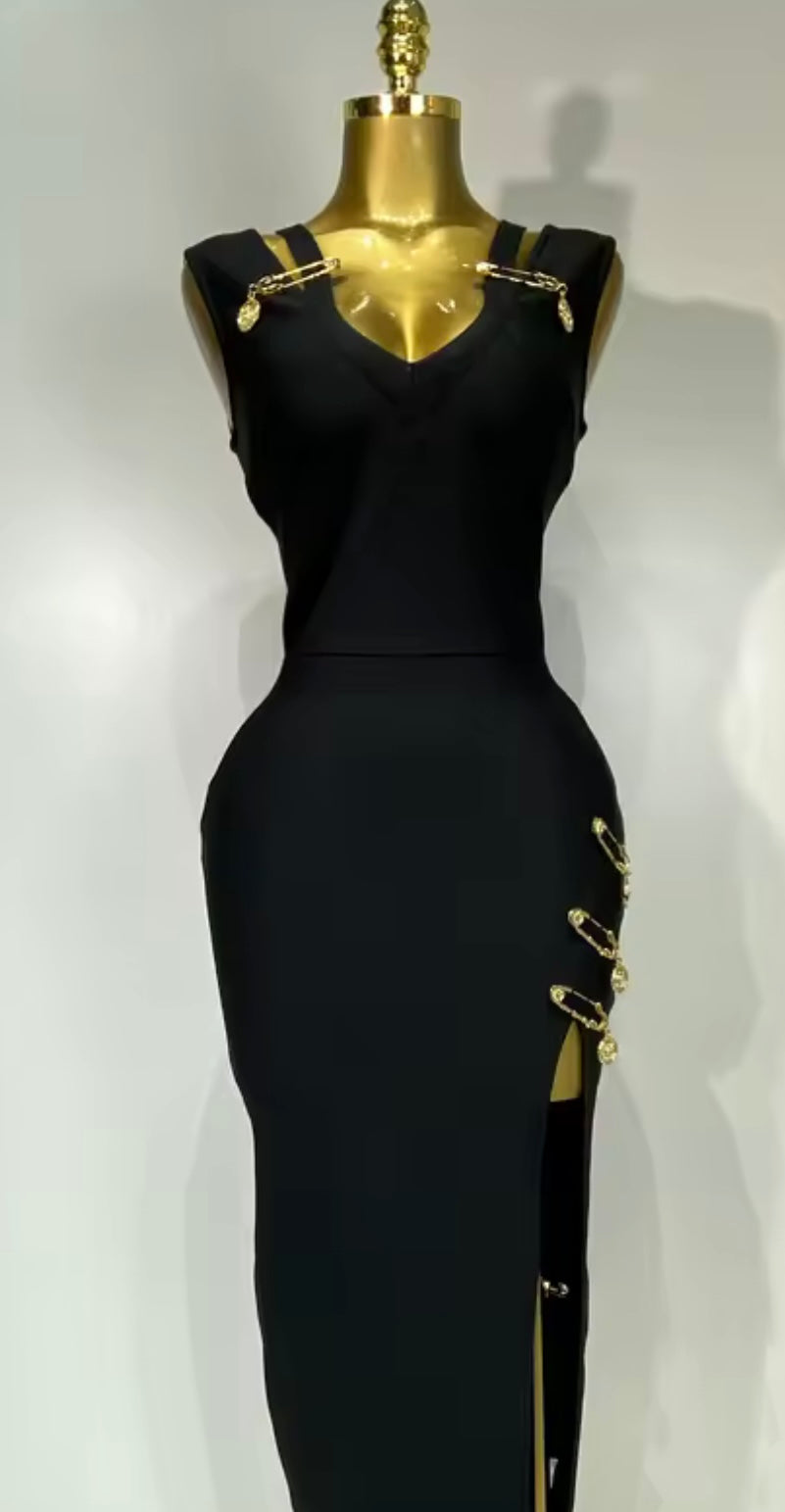 • A cluster of pins runs down the side of the skirt, securing a high slit and adding a provocative, edgy flair.