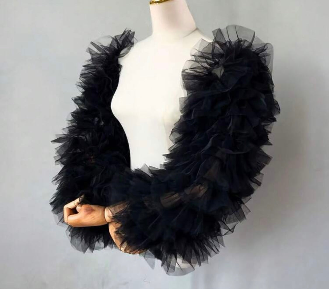 This is a pair of black, sheer, ruffled tulle sleeves. They are designed to be worn separately and are very voluminous, creating a dramatic, billowy effect from the shoulder down to the wrist.