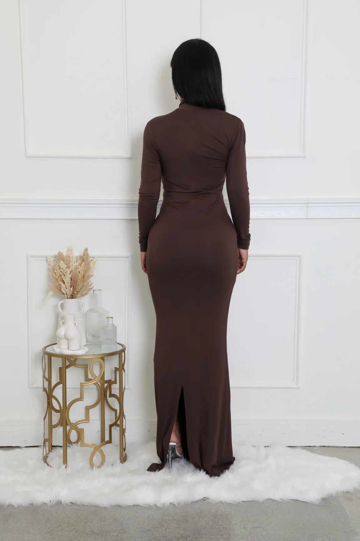 This is a floor-length maxi dress in a rich, chocolate brown hue. It features a unique asymmetrical neckline with a daring one-shoulder cutout that adds a modern, architectural twist to a classic silhouette. The long sleeves and form-fitting fabric create a streamlined, statuesque look that celebrates every curve