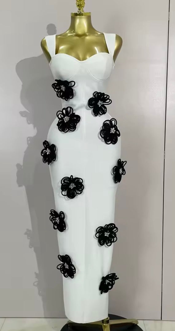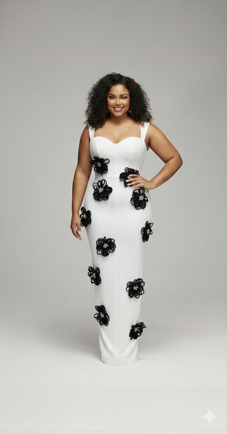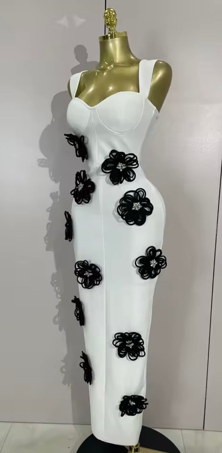 The standout detail is the scattered 3D floral appliqués made from coiled black piping, each finished with a shimmering crystalline center. The high-contrast "black on white" palette makes it feel both classic and avant-garde