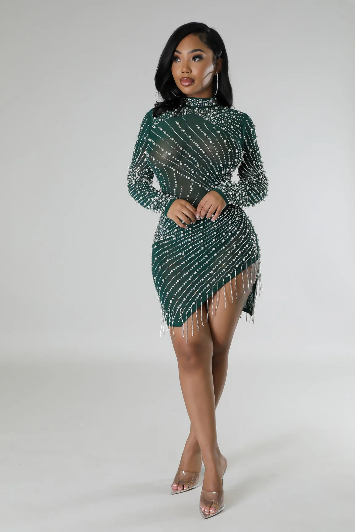 These are highly detailed, figure-hugging mini dresses designed to make a bold, glamorous statement. They appear to be made of a sheer or mesh fabric in two different colors: dark emerald green and black.